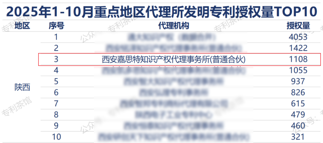 近日,第三方平台“专利茶馆”根据MindFlow最新统计数据发布了“2025年1-10月代理机构发明专利授权量排行榜TOP300”和“2025年1-10月重点地区代理所发明专利授权量TOP10”,数据显示,西安嘉思特知识产权代理事务所发明专利授权量全国排名前100,陕西地区排名第3!彰显出我所处理大规模专利申请布局的专业能力、高效执行力与交付可靠性。