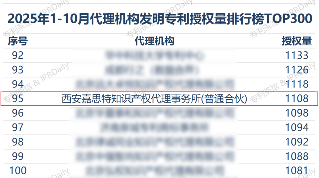 2025年1-10月代理机构发明专利授权量排行榜(陕西)2025年1-10月代理机构发明专利授权量排行榜(全国)数据来源:MindFlow,数据会因为公开周期等因素造成一定误差。数据检索日为2025年11月3日,数据为不完全统计,未做完全标准化处理,数据未考虑特殊情况,与任何指标无关,以官方公开数据为准仅供参考。未来,嘉思特知识产权将持续以专业力量和高效服务,充分发挥知识产权在驱动创新发展中的关键作用,以高质量知识产权服务链条支撑专利高效转化,为陕西乃至全国创新主体的技术保护与成果转化铺设坚实基石。